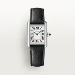 Luxuriously refined in stainless steel with a diamond-set bezel, this small Tank Must features a black leather strap for a sleek finish.