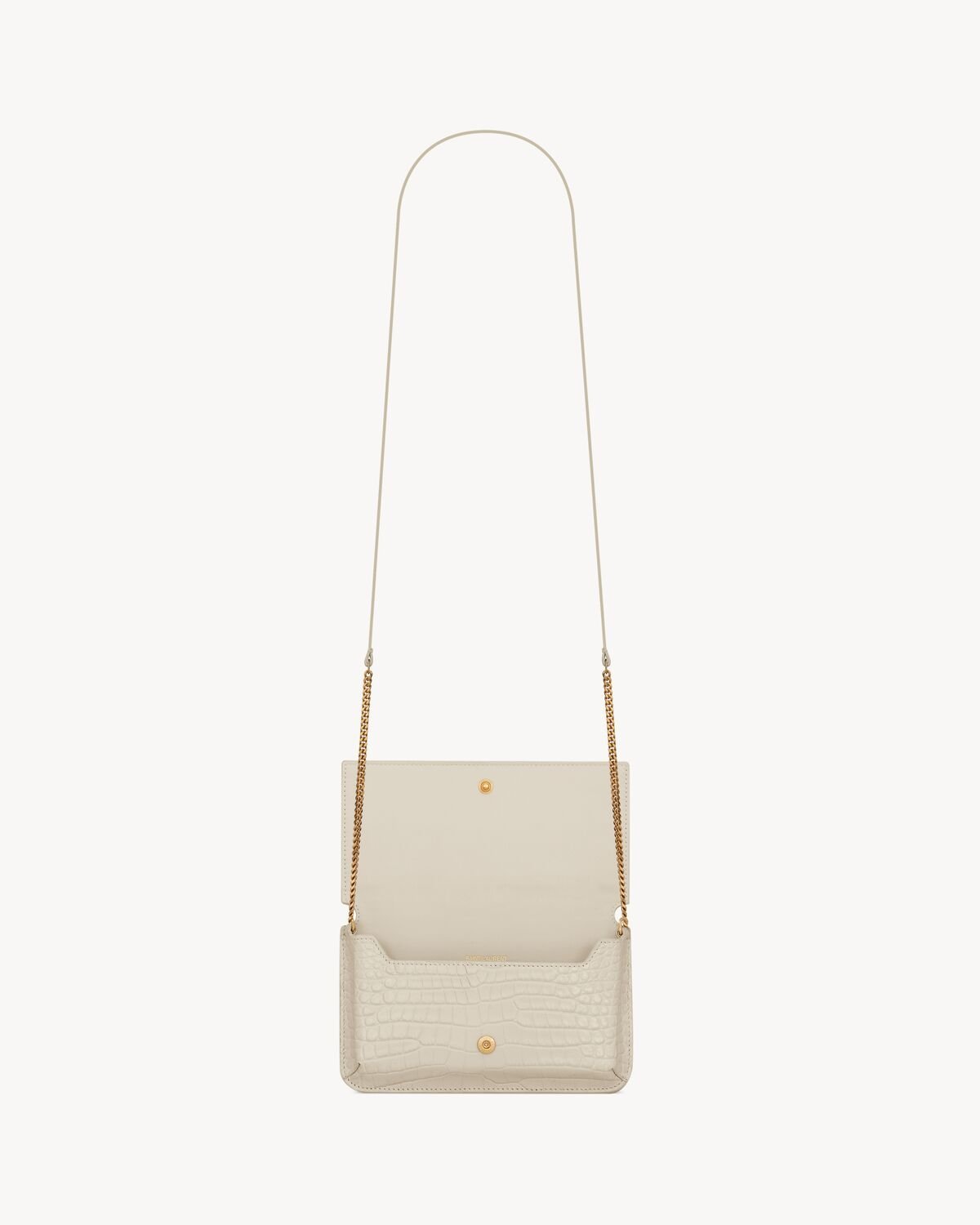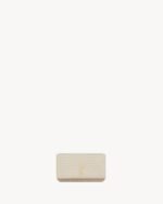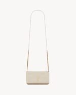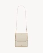 Cell phone holder with front flap decorated WITH THE CASSANDRE, featuring a leather and chain shoulder strap.
