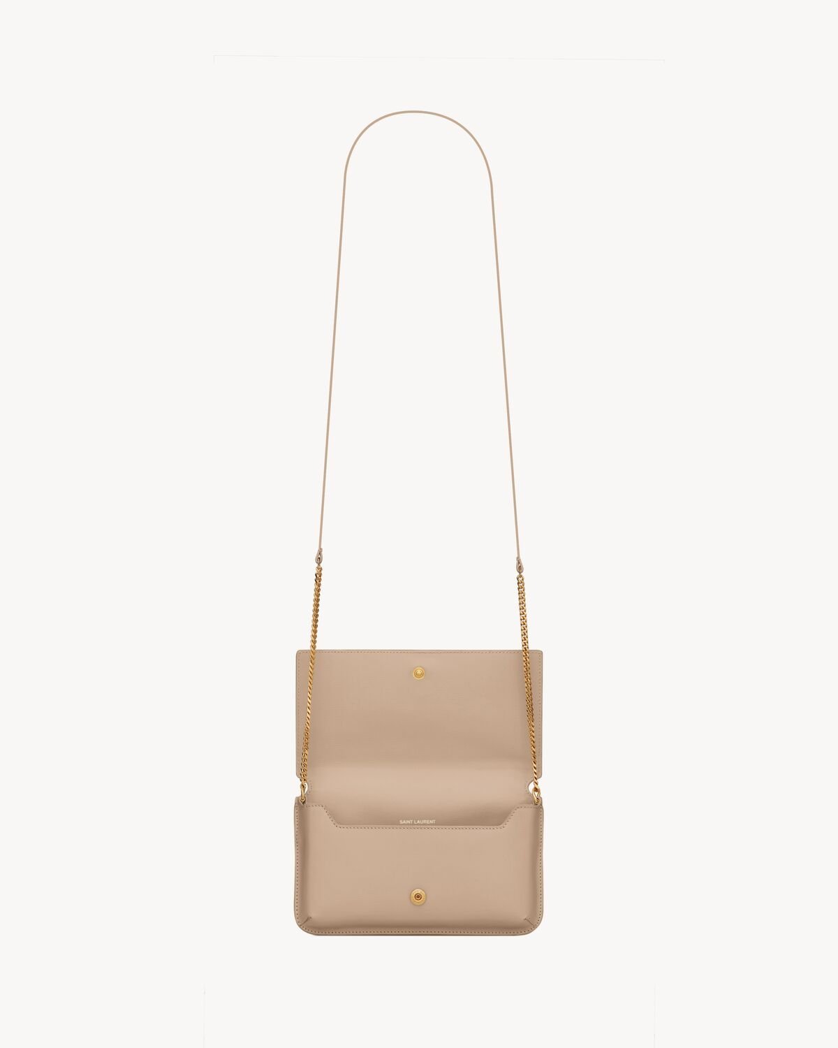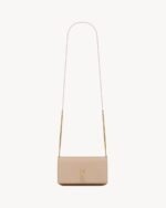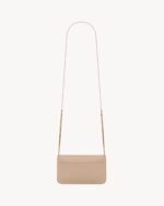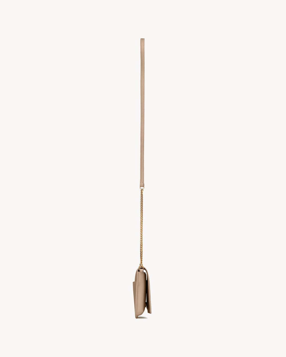 Cell phone holder with front flap decorated WITH THE CASSANDRE, featuring a leather and chain shoulder strap.