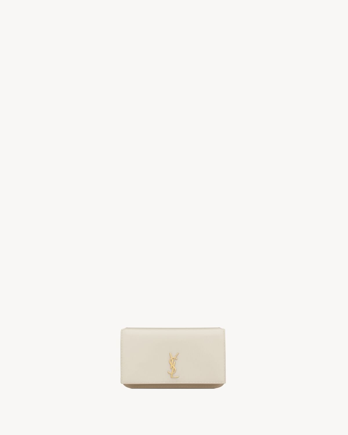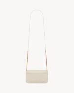 Cell phone holder with front flap decorated WITH THE CASSANDRE, featuring a leather and chain shoulder strap.