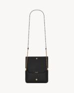 Cell phone holder with front flap decorated WITH THE CASSANDRE, featuring a leather and chain shoulder strap.
