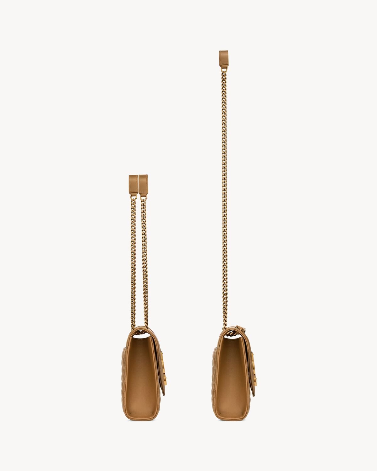 This versatile piece features a sliding leather-and-chain strap that can be worn two ways.