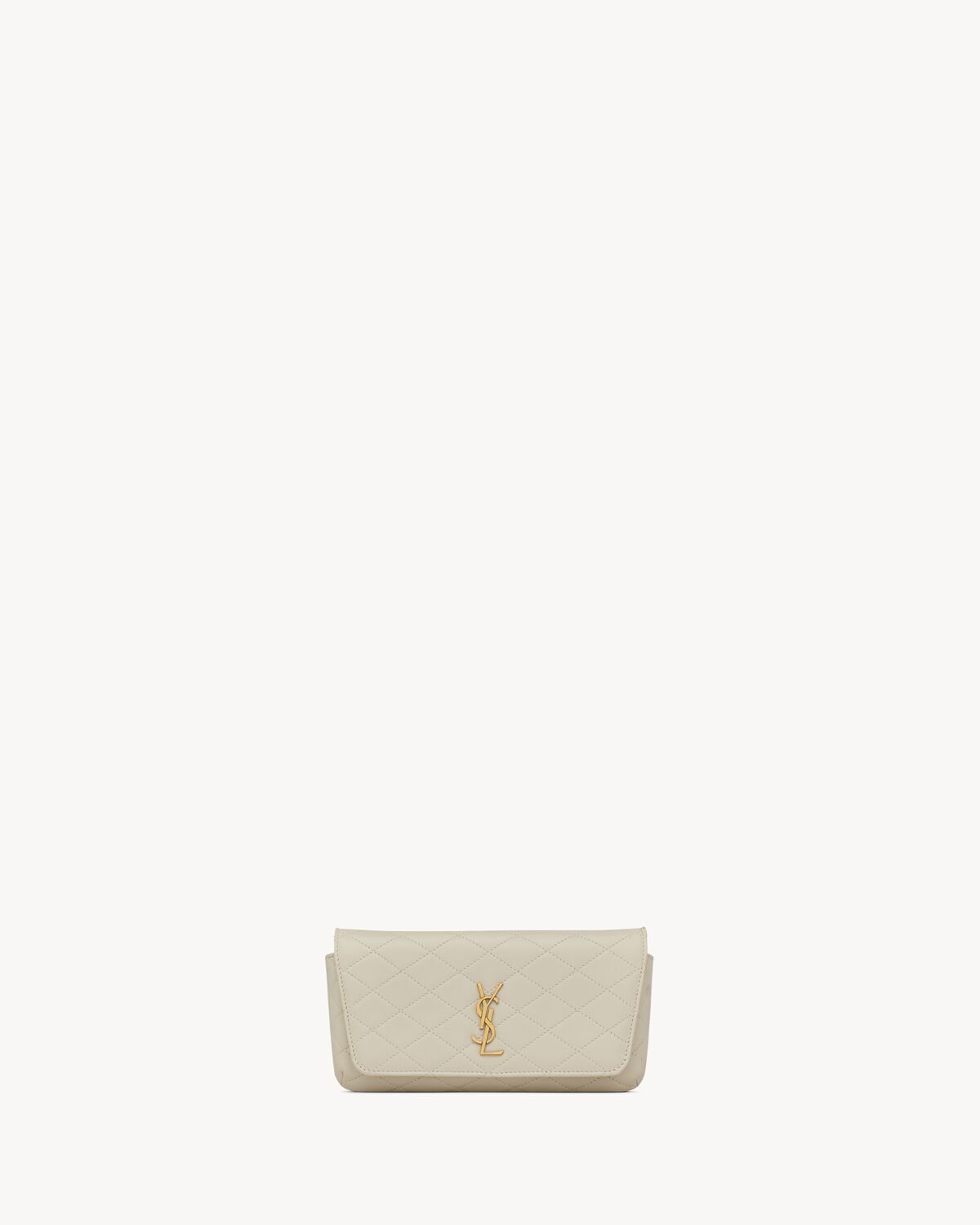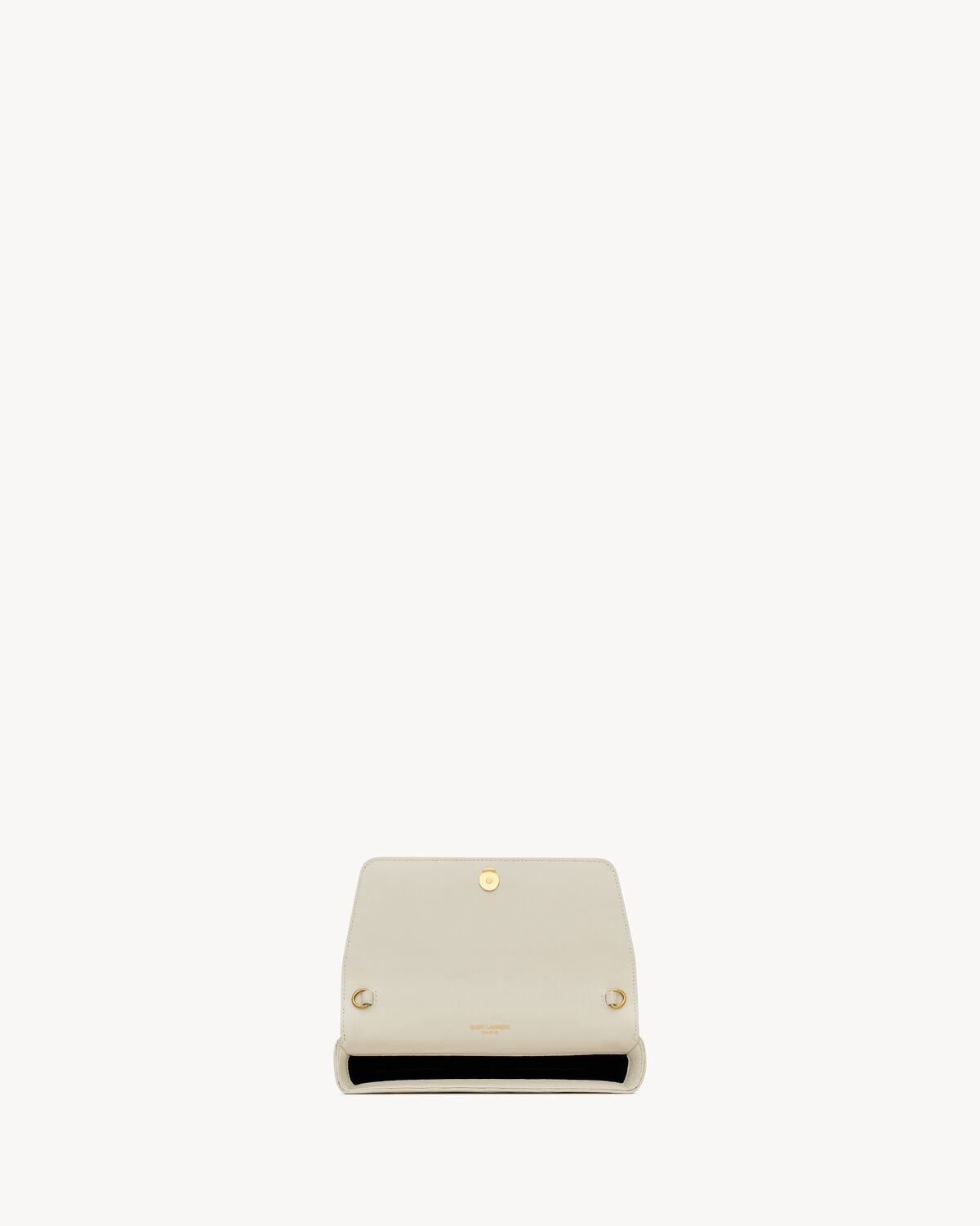 phone holder with front flap, decorated with the CASSANDRE and diamond-quilted overstitching, featuring a chain shoulder strap.
