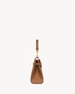 Top-handle bag with small flap on top and compression tabs on the sides, featuring a leather and chain top handle.