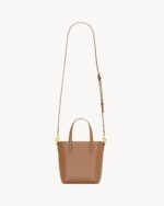 This piece may be carried as a handbag or worn crossbody with an adjustable and detachable strap.