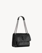 FEATURES A SLIDING CHAIN STRAP THAT CAN BE WORN ON THE SHOULDER OR CROSSBODY.