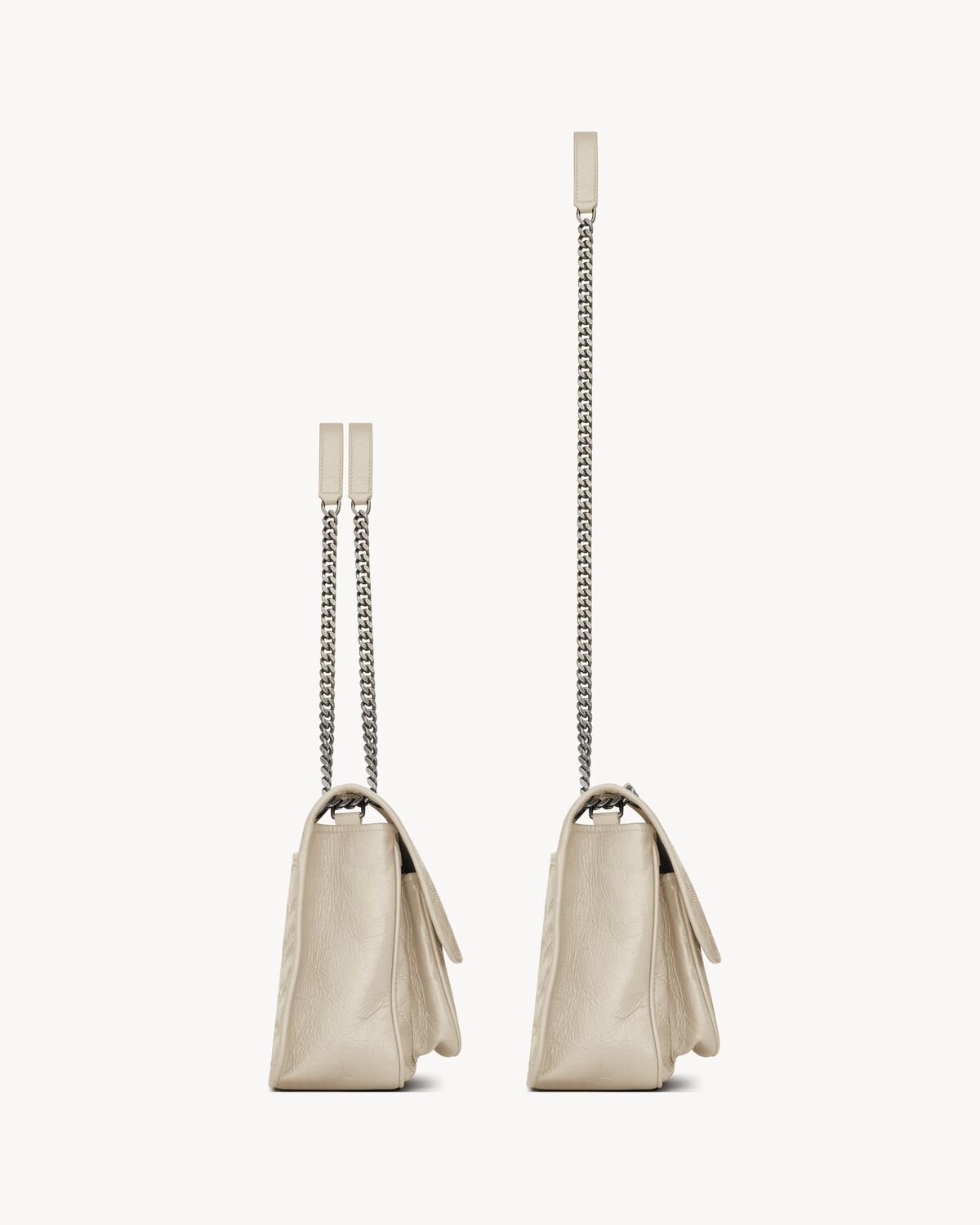 FEATURES A SLIDING CHAIN STRAP THAT CAN BE WORN ON THE SHOULDER OR CROSSBODY.