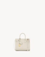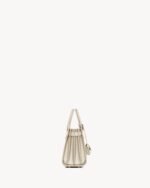 Compact and leather-lined, it is distinguishable by its accordion sides, snap tabs and brass padlock.
